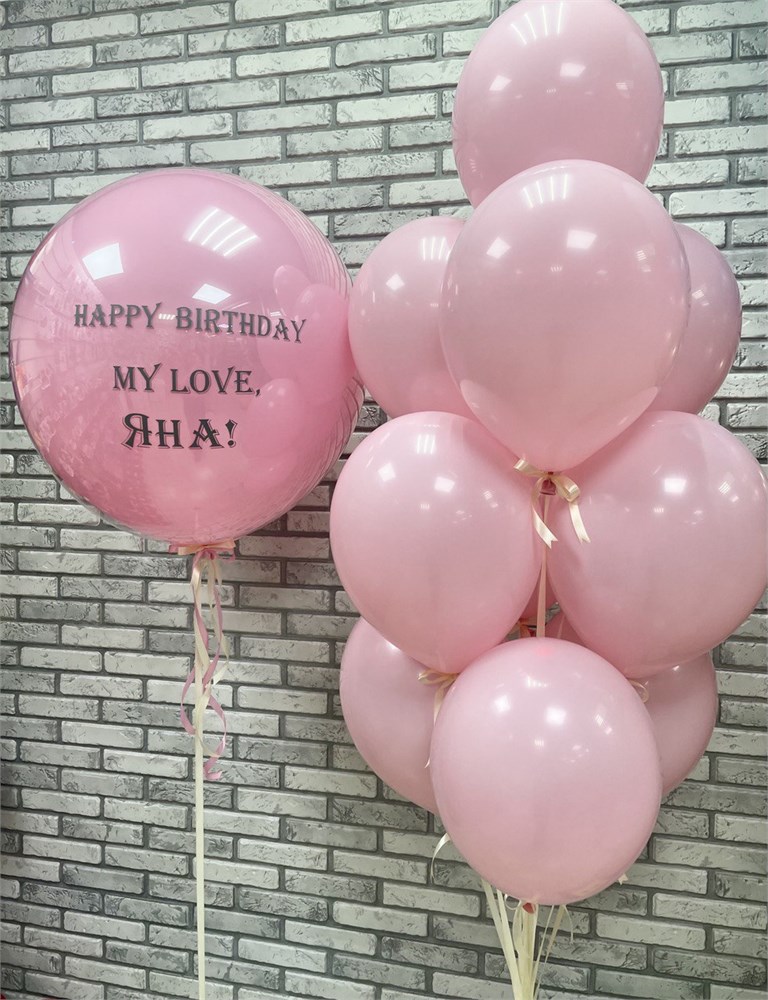 Набор воздушных шаров на день рождения "Зефирка".Набор с большим стеклянным шаров и фонтаном из воздушных шаров на атласных лентах с бантиками. Так набор станет идеальным подарком для девушек.