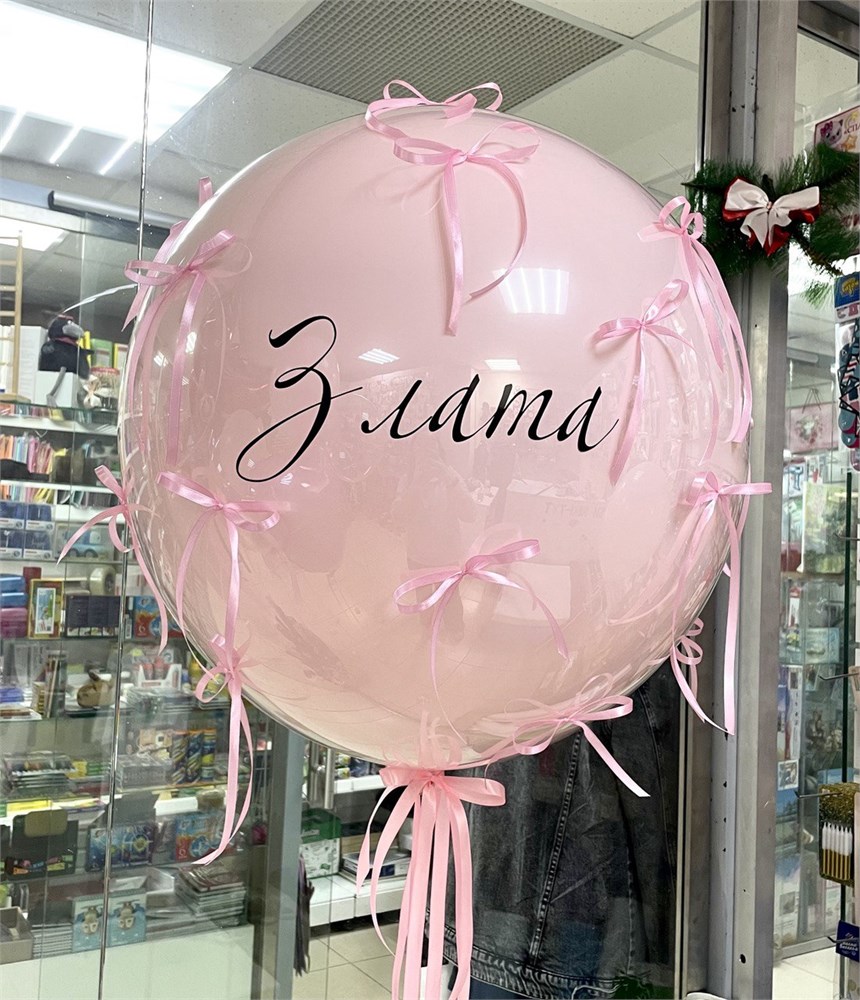 Шар гигант стеклянный розовый с надписью и бантиками.